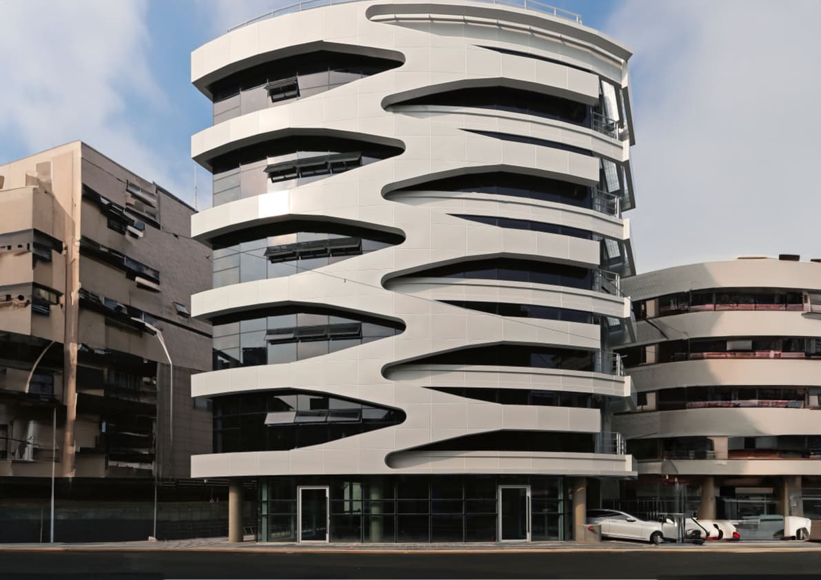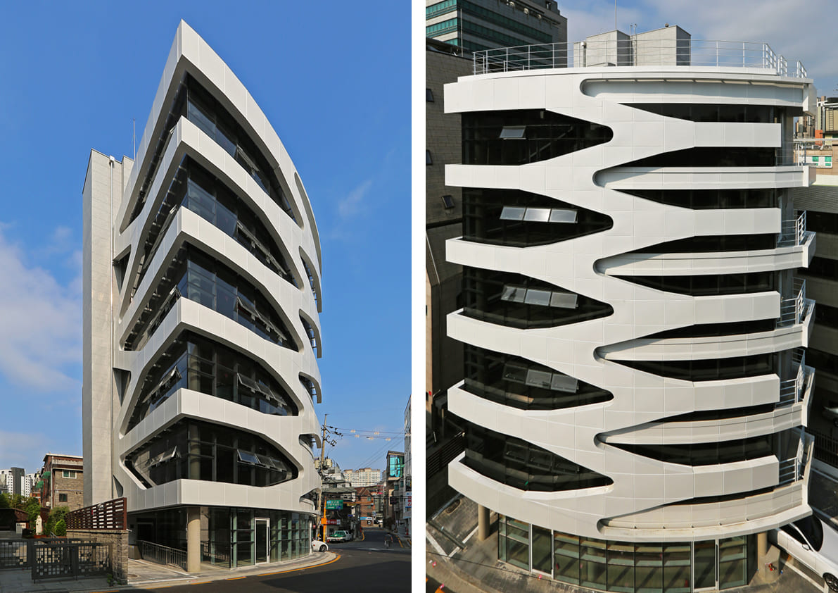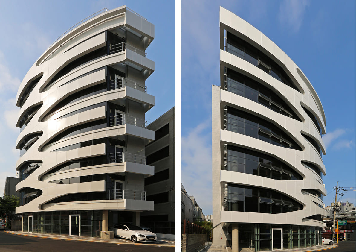 The elevations of the project follow the lines of the surrounding roads and the curves and straight lines of aluminum panels are combined to form a unique three-dimensional effect. Inside, the part that touches the core is used as a public space, and the private space is located as you enter the north. The project was designed with a focus on forming an independent identity by utilizing the characteristics and conditions of the land.